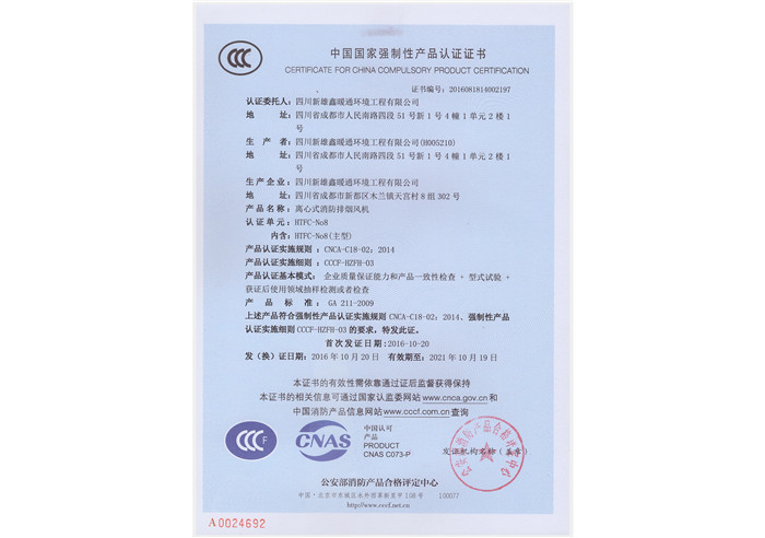 离心式消防排烟风机 证书
